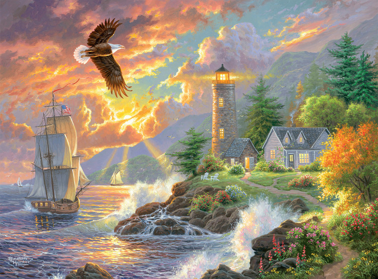 Set sail for a scenic adventure with this 1000-piece jigsaw puzzle featuring the artwork of Abraham Hunter. A tall ship glides past a rocky coastline as waves crash below a shining lighthouse and a bald eagle soars overhead. With vibrant colors and majestic details, this puzzle offers a breathtaking glimpse of coastal beauty. Finished size is 26.75 x 19.75 inches. Recommended for ages 14+